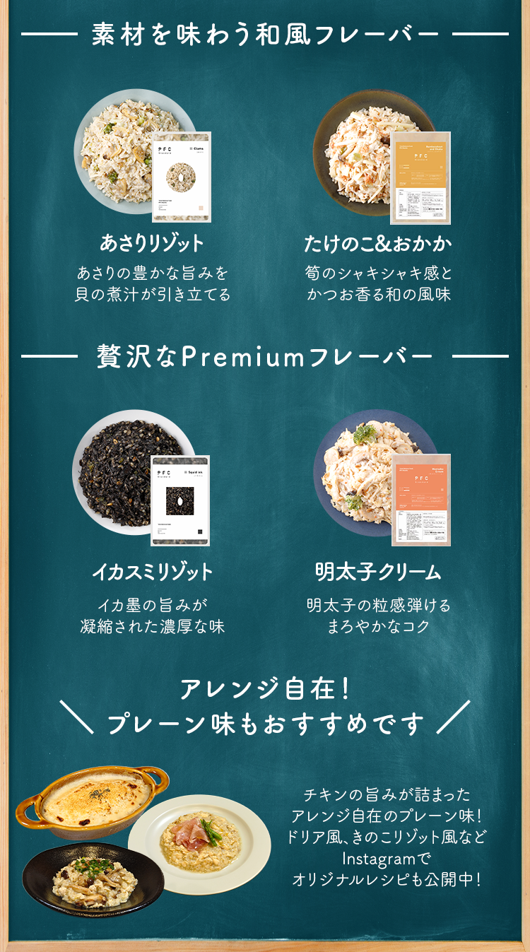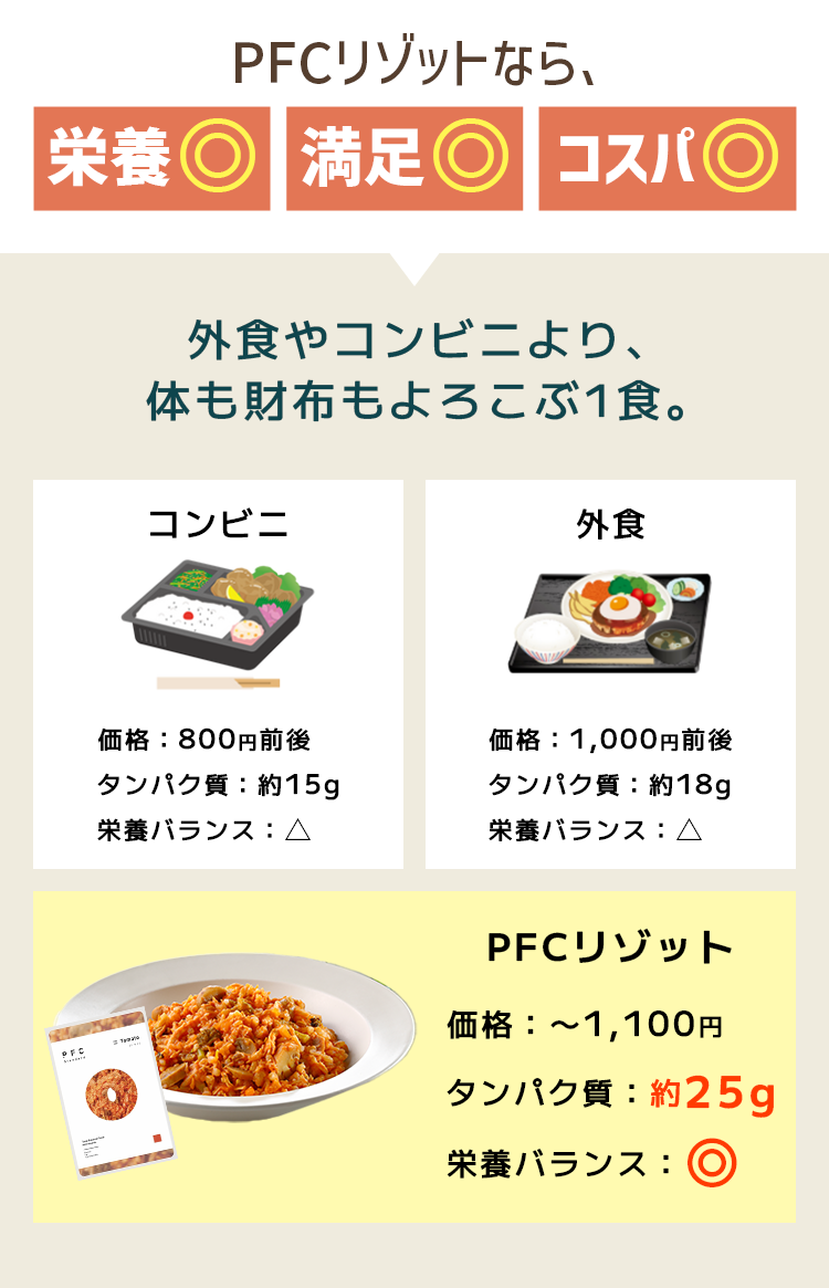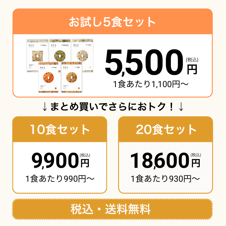 ご希望のセット数をお選びください \おすすめ/ お試し5食セット PFCリゾット 選べるお試し5食セット ¥5,500 今すぐ購入する 10食セット PFCリゾット 選べる10食セット ¥9,900 今すぐ購入する 20食セット PFCリゾット 選べる20食セット ¥18,600 今すぐ購入する \お好きなネットショップでもご購入できます!/